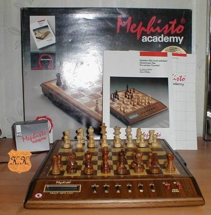 Dieses Gerät habe ich erst vor kurzem erstanden (2001) und ist absolut neuwertig. Wie schon beim Saitek Präsident erwähnt, zählt die Academy (nicht zu verwechseln mit der aktuellen Akademie aus Plastik) zum absoluten Favoritenkreis für Hobbyspieler. Deie Spielstärke ist mit 1939 ELO mehr als ausreichend, bietet jeden erdenklichen Komfort und garantiert dadurch für jahrelanges Vergnügen. Sie hat wirklich viele Vorzüge, das Brett ist handlich aber nicht zu klein, Elo-Stufen etc etc. etc. Da kann man nur sagen eine Empfehlung wert. Trotzdem er kein richtiges Spitzengerät war habe ich eine sehr grüße Freude damit, da das Preisleistungs Verhältnis in Ordnung war, die Academy kostete 550,- EURO. Das Gerät ist wie schon oben geschrieben absolut neuwertig und mit sämtlichen Originalzubehör, eines meiner schönsten Geräte. |