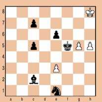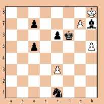 Seite 7 (5) DIAGRAMM 2: wKh8,Pe3,g5,h5/bKf5,Ne1,Bc2,Pc5,c7,e6 G. Nadareischwili, 1950; Weiß am Zug gewinnt Lösung: 1.g6 Kf6 2.g7 Lh7 (5a) DIAGRAMM 3 :