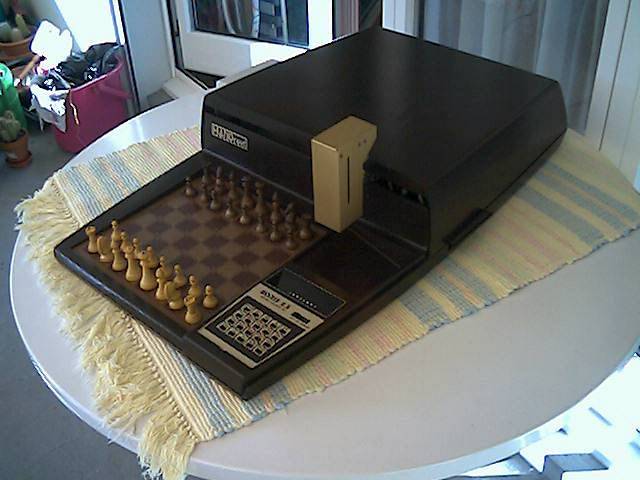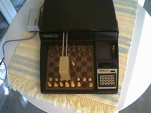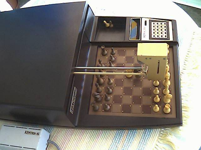Presse den ersten elektronischen Schachroboter der Welt. Seit Ende 1980