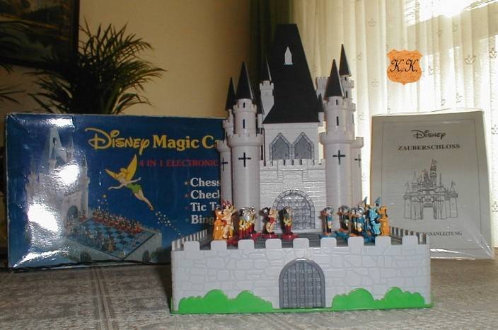 Das Schach spielende Disney Zauberschloss ist aus heutiger Sicht zu einer echten Rarität unter den Schachcomputer Sammlern geworden. Die sehr schön gemachten Figuren sind einzeln mit der Hand bemalt und bestehen aus einen Figurensatz der Ducks und einen Satz der Mickey Mouse. Mehr Informationen gibt es hier: Novag Magic Disney Castle Besitzer dieses Geräts (Bild) ist: Kurt Kispert (A) Seriennummer 500376 Weitere Besitzer: Steve Blincoe (USA) Serienummer 502065,